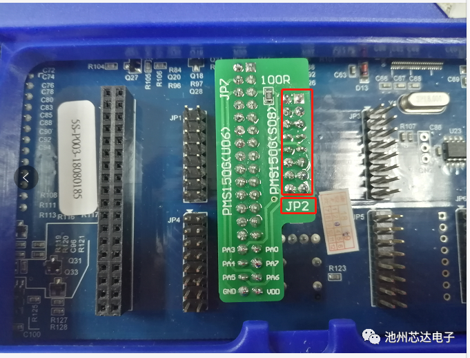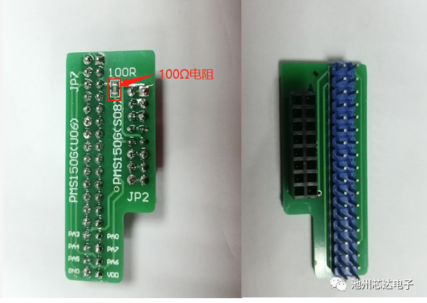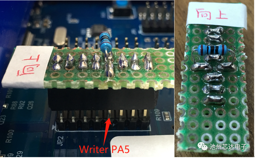 以PMS150G-S08為例,為提升IC批量燒錄的穩(wěn)定性及可靠性,燒錄前,請?jiān)赪riter背后JP2的PA5引腳上串一個100?的電阻。連接方式參考如下圖: