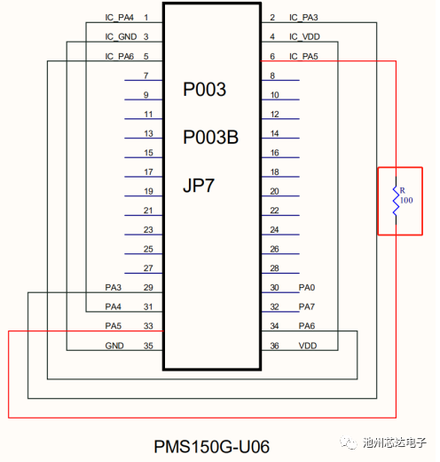 2.若燒錄U06封裝的IC,請?jiān)贘P7的PA5引腳處串一個100?的電阻,連接方式如下圖: